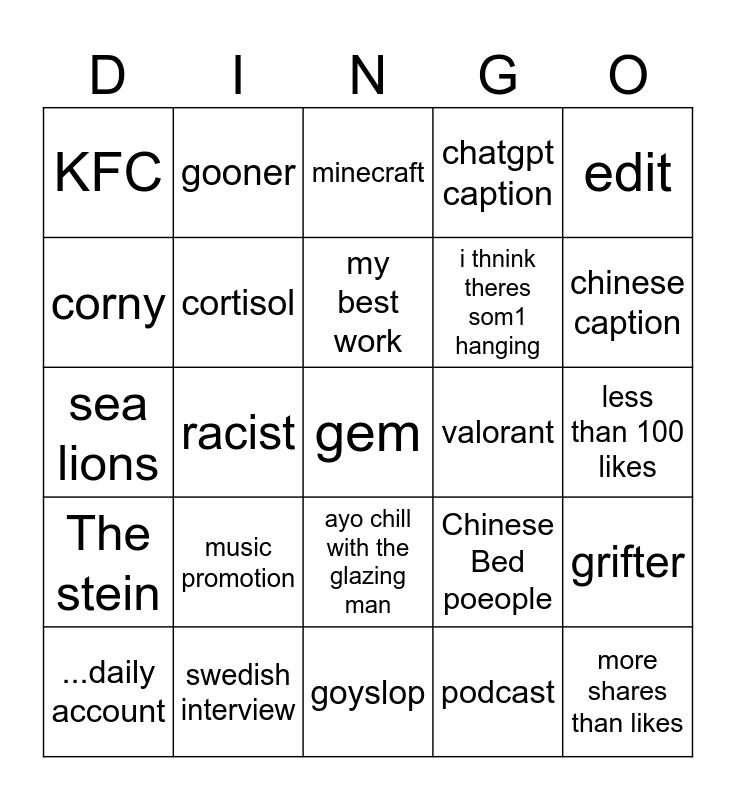 This bingo card has a free space and 24 words: music promotion, swedish interview, my best work, ...daily account, edit, KFC, corny, gooner, valorant, ayo chill with the glazing man, i thnink theres som1 hanging, sea lions, Chinese Bed poeople, grifter, cortisol, podcast, less than 100 likes, minecraft, chinese caption, racist, more shares than likes, The stein, chatgpt caption and goyslop.