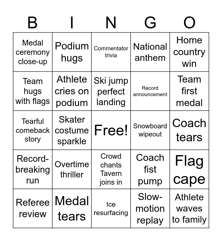 This bingo card has a free space and 35 words: Figure skater falls, Photo finish replay, Surprise gold medal, Athlete cries on podium, Crowd chants Tavern joins in, National anthem, Team hugs with flags, Coach celebration, Ski jump perfect landing, Breaking news interruption, Tearful comeback story, Home country win, Overtime hockey win, Curling strategy close-up, Medal ceremony close-up, Snowboard wipeout, Slow-motion replay, Skater costume sparkle, Record-breaking run, Athlete waves to family, Coach fist pump, Referee review, Flag cape, Medal tears, Commentator trivia, Team first medal, Goalie saves, Figure skating spin, Record announcement, Coach tears, Flag raised, Ice resurfacing, Overtime thriller, Podium hugs and Rookie wins gold.