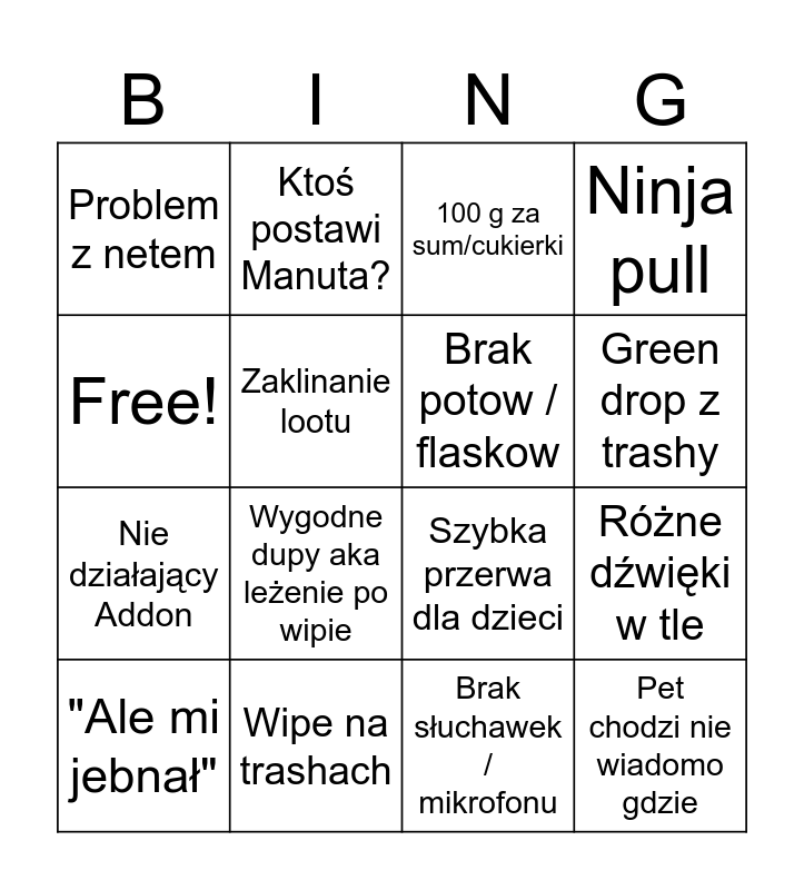 This bingo card has 16 words: Wipe na trashach, Różne dźwięki w tle, 100 g za sum/cukierki, Problem z netem, Nie działający Addon, Ktoś postawi Manuta?, Szybka przerwa dla dzieci, Brak słuchawek / mikrofonu, Free!, Zaklinanie lootu, "Ale mi jebnał", Ninja pull, Wygodne dupy aka leżenie po wipie, Green drop z trashy, Brak potow / flaskow and Pet chodzi nie wiadomo gdzie.