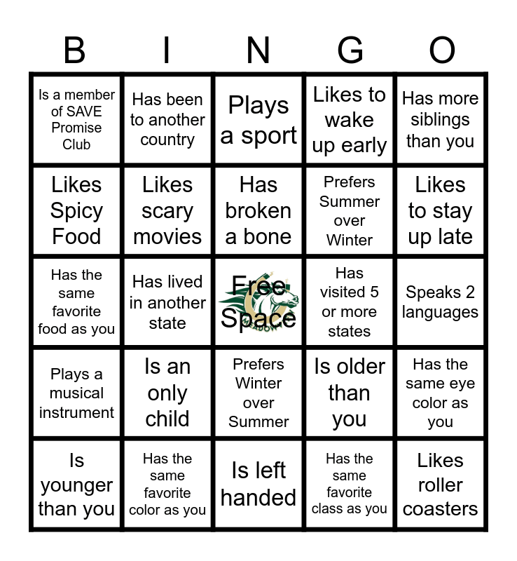 This bingo card has a free space and 24 words: Is an only child, Has the same favorite color as you, Has broken a bone, Is younger than you, Has more siblings than you, Is a member of SAVE Promise Club, Likes Spicy Food, Has been to another country, Has visited 5 or more states, Prefers Winter over Summer, Prefers Summer over Winter, Has the same favorite food as you, Is older than you, Has the same eye color as you, Likes scary movies, Has the same favorite class as you, Speaks 2 languages, Plays a sport, Likes to stay up late, Has lived in another state, Likes roller coasters, Plays a musical instrument, Likes to wake up early and Is left handed.