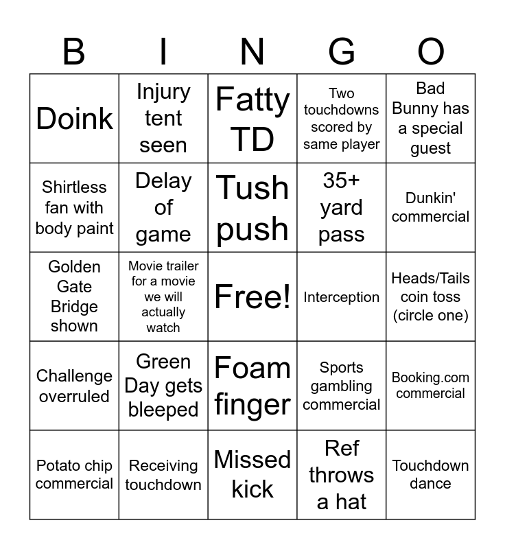 This bingo card has a free space and 49 words: Face mask, Touchdown dance, Diving catch, Missed kick, Green Day gets bleeped, Team uses third time out, Injury tent seen, Commercial that makes no sense, Shirtless fan with body paint, Tom Brady mentioned, Delay of game, Two touchdowns scored by same player, Booking.com commercial, Sports gambling commercial, Roughing the passer, Fumble, Tush push, Interception, Weather update, Bad Bunny has a special guest, Movie trailer for a movie we will actually watch, Ref throws a hat, Doink, 35+ yard pass, Food delivery app commercial, Dunkin' commercial, Potato chip commercial, 4th down conversion, Foam finger, Challenge overruled, Play gets overturned, Mascot shown, Audience member wearing team hat, Passing touchdown, Receiving touchdown, Clydesdale, Olympics update or mention, Knee injury, Heads/Tails coin toss (circle one), Fans boo, Player cries during anthem, Pass interference, Trick play, 2 unanswered scores, Golden Gate Bridge shown, Fatty TD, Two point conversion, Player crashes into photographer and Soda commercial.