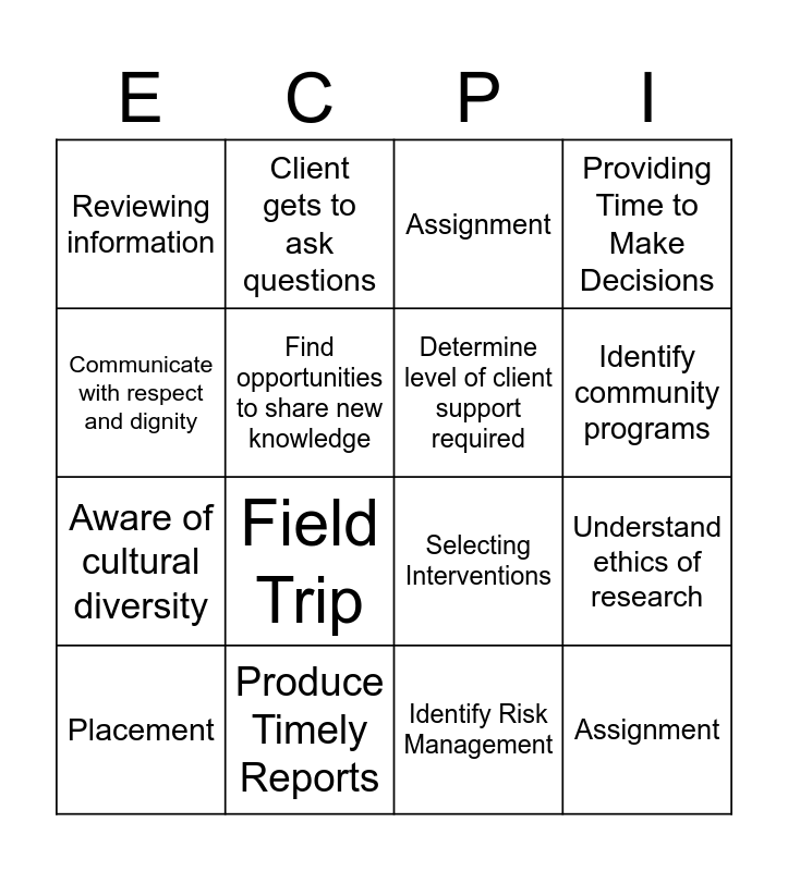 This bingo card has 25 words: Work within scope, Course Based, Selecting Interventions, Follow Infection Control, Reviewing information, Client gets to ask questions, Assignment, Providing Time to Make Decisions, Aware of cultural diversity, Field Trip, Identify Risk Management, Understand ethics of research, Reviewing assessment findings, Produce Timely Reports, Determine level of client support required, Identify areas for modification, Placement, Find opportunities to share new knowledge, Seek out learning opportunities, Assignment, Communicate with respect and dignity, Identify how research influences best practice, Volunteer Recruitment, Identify community programs and Seek others perspective.