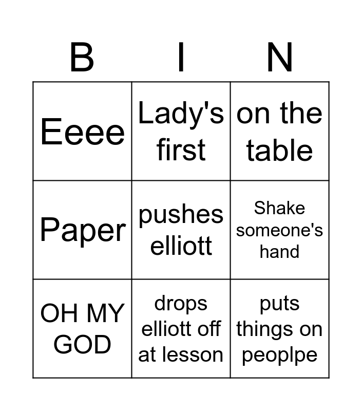 This bingo card has 9 words: OH MY GOD, on the table, Lady's first, Paper, Eeee, Shake someone's hand, pushes elliott, puts things on peoplpe and drops elliott off at lesson.