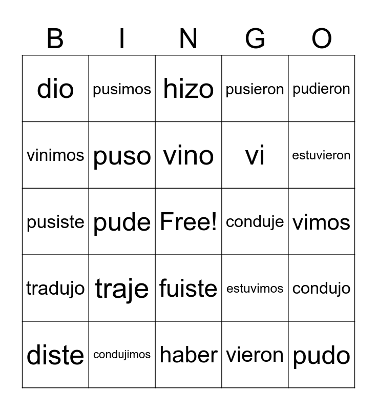 This bingo card has a free space and 77 words: hice, hiciste, hizo, hicimos, hicieron, quise, quisiste, quiso, quisimos, quisieron, vine, viniste, vino, vinimos, vinieron, pude, pudiste, pudo, pudimos, pudieron, puse, pusiste, puso, pusimos, pusieron, supe, supiste, supo, supimos, supieron, estuve, estuviste, estuvo, estuvimos, estuvieron, vi, viste, vio, vimos, vieron, tuve, tuviste, tuvo, tuvimos, tuvieron, di, diste, dio, dimos, dieron, fui, fuiste, fue, fuimos, fueron, dije, dijiste, dijo, dijimos, dijeron, traje, trajiste, trajo, trajimos, trajeron, condujeron, tradujeron, conduje, traduje, condujiste, tradujiste, condujo, tradujo, condujimos, tradujimos, haber and hubo.