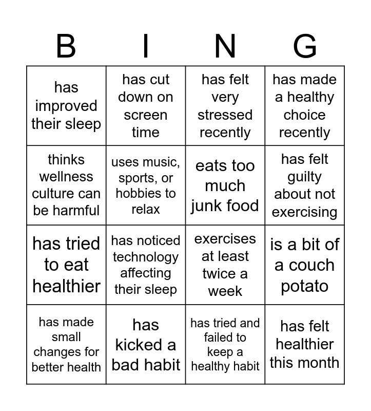 This bingo card has 16 words: has kicked a bad habit, is a bit of a couch potato, has felt very stressed recently, has improved their sleep, has tried to eat healthier, has cut down on screen time, exercises at least twice a week, has tried and failed to keep a healthy habit, thinks wellness culture can be harmful, uses music, sports, or hobbies to relax, has made small changes for better health, has made a healthy choice recently, has noticed technology affecting their sleep, has felt guilty about not exercising, eats too much junk food and has felt healthier this month.