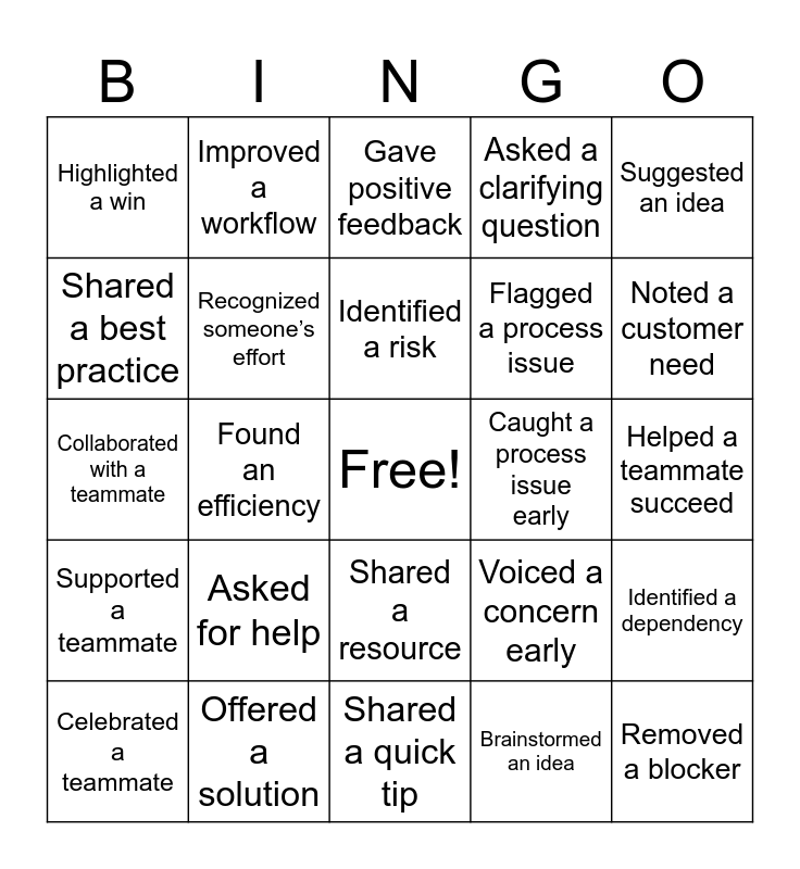 This bingo card has a free space and 24 words: Asked for help, Offered a solution, Identified a risk, Celebrated a teammate, Suggested an idea, Highlighted a win, Shared a best practice, Improved a workflow, Caught a process issue early, Shared a resource, Flagged a process issue, Collaborated with a teammate, Voiced a concern early, Identified a dependency, Recognized someone’s effort, Brainstormed an idea, Helped a teammate succeed, Gave positive feedback, Noted a customer need, Found an efficiency, Removed a blocker, Supported a teammate, Asked a clarifying question and Shared a quick tip.