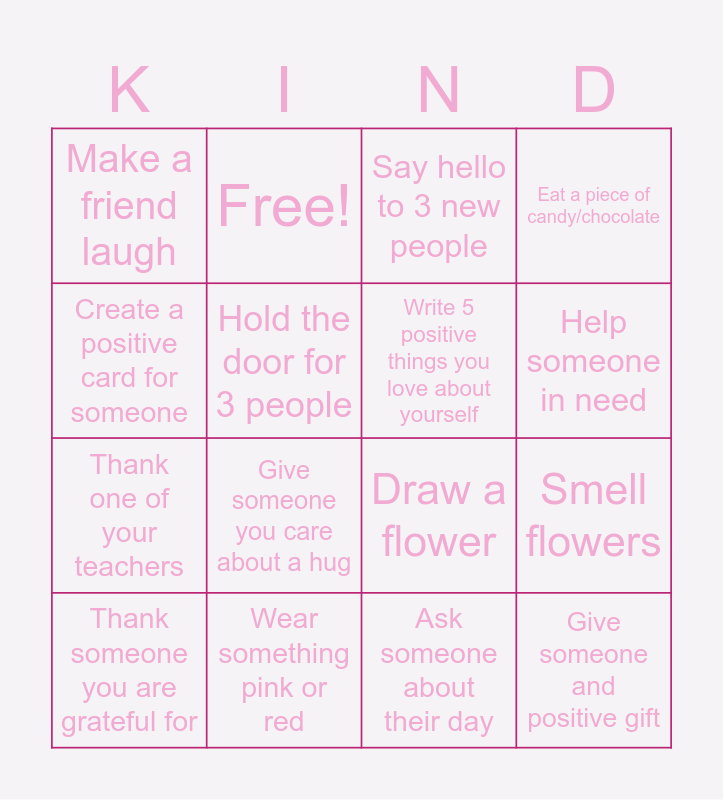 This bingo card has 16 words: Wear something pink or red, Smell flowers, Say hello to 3 new people, Make a friend laugh, Thank one of your teachers, Free!, Draw a flower, Ask someone about their day, Create a positive card for someone, Hold the door for 3 people, Thank someone you are grateful for, Eat a piece of candy/chocolate, Give someone you care about a hug, Help someone in need, Write 5 positive things you love about yourself and Give someone and positive gift.