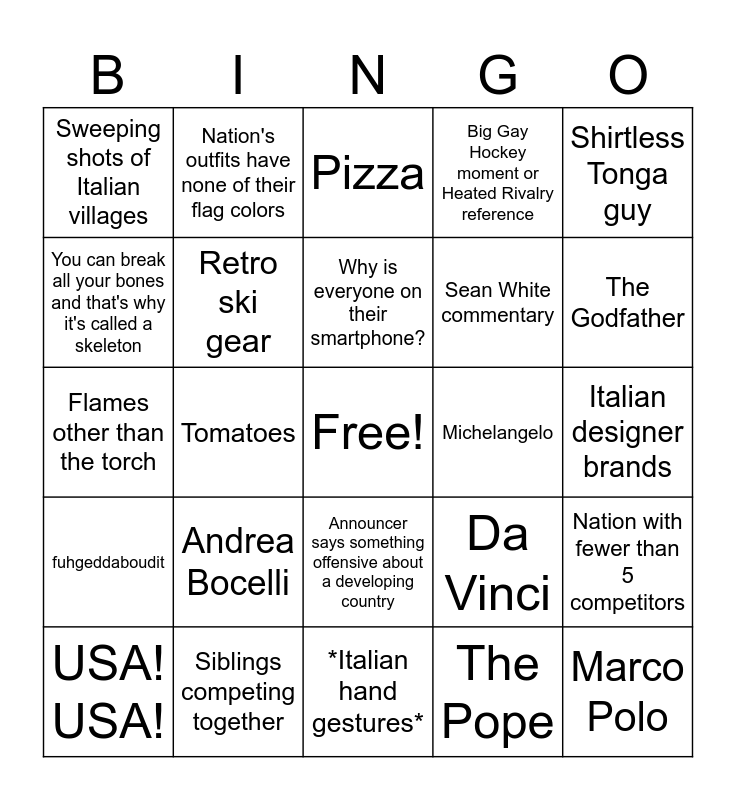 This bingo card has a free space and 31 words: *Italian hand gestures*, Maneskin, Tomatoes, Pasta, Sweeping shots of Italian villages, Pizza, Retro ski gear, Da Vinci, Michelangelo, The Pope, Italian designer brands, Marco Polo, Astronomy & Physics Contributions, Mispronounced Italian words, The Godfather, Snoop Dogg, Nation with fewer than 5 competitors, Andrea Bocelli, fuhgeddaboudit, Announcer says something offensive about a developing country, Shirtless Tonga guy, Trinidad and Tobaggan, USA! USA!, Nation's outfits have none of their flag colors, Sean White commentary, You can break all your bones and that's why it's called a skeleton, Big Gay Hockey moment or Heated Rivalry reference, Flames other than the torch, Siblings competing together, Why is everyone on their smartphone? and Super Bowl reference.