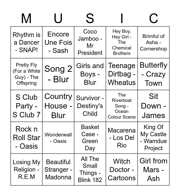 This bingo card has a free space and 39 words: There She Goes - The La's, Alright - Supergrass, Live Forever - Oasis, Song 2 - Blur, Losing My Religion - R.E.M, Basket Case - Green Day, Girls and Boys - Blur, Common People - Pulp, Brimful of Asha - Cornershop, Rock n Roll Star - Oasis, Country House - Blur, Hey Boy, Hey Girl - The Chemical Brothers, Girl from Mars - Ash, Sit Down - James, The Riverboat Song - Ocean Colour Scene, Wonderwall - Oasis, Staying Out For The Summer - Dodgy, Rhythm is a Dancer - SNAP!, No Limit - 2 Unlimited, Macarena - Los Del Rio, Pretty Fly (For a White Guy) - The Offspring, All The Small Things - Blink 182, Teenage Dirtbag - Wheatus, Butterfly - Crazy Town, What A Beautiful Day - The Levellers, The River of Dreams - Billy Joel, Rock DJ - Robbie Williams, Saturday Night -Whigfield, Who Do You Think You Are - Spice Girls, Encore Une Fois - Sash, Spice Up Your Life - Spice Girls, Professional Widow - Tori Amos, Coco Jamboo - Mr President, Beautiful Stranger - Madonna, Witch Doctor - Cartoons, We Like To Party - VengaBoys, King Of My Castle - Wamdue Project, S Club Party - S Club 7 and Rewind - Craig David.