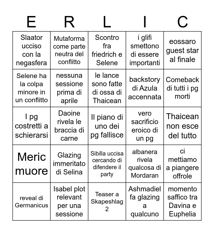 This bingo card has a free space and 24 words: Glazing immeritato di Selina, Isabel plot relevant per una sessione, le lance sono fatte di ossa di Thaicean, reveal di Germanicus, eossaro guest star al finale, Slaator ucciso con la negasfera, Selene ha la colpa minore in un conflitto, Mutaforma come parte neutra del conflitto, vero sacrificio eroico di un pg, Sibilla uccisa cercando di difendere il party, backstory di Azula accennata, I pg costretti a schierarsi, albanera rivela qualcosa di Mordaran, ci mettiamo a piangere offrole, nessuna sessione prima di aprile, Ashmadiel fa glazing a qualcuno, Thaicean non esce del tutto, Scontro fra friedrich e Selene, Comeback di tutti i pg morti, Daoine rivela le braccia di carne, momento saffico tra Davina e Euphelia, Meric muore, i glifi smettono di essere importanti and Teaser a Skapeshlag 2.