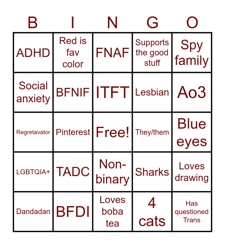 This bingo card has a free space and 24 words: TADC, BFDI, ITFT, Dandadan, Spy family, ADHD, Social anxiety, Red is fav color, They/them, Non-binary, Lesbian, Regretavator, Sharks, Loves drawing, BFNIF, 4 cats, Blue eyes, FNAF, Ao3, Pinterest, Has questioned Trans, LGBTQIA+, Supports the good stuff and Loves boba tea.