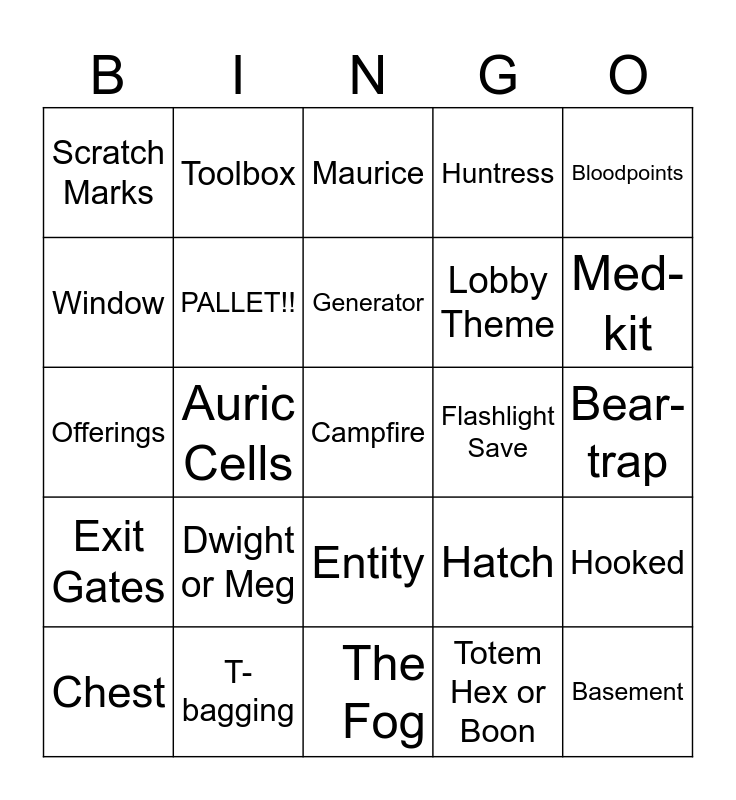 This bingo card has a free space and 24 words: Chest, Dwight or Meg, Generator, Totem Hex or Boon, Bloodpoints, Scratch Marks, Toolbox, Maurice, Flashlight Save, Bear-trap, Offerings, PALLET!!, Hatch, Hooked, Window, T-bagging, The Fog, Huntress, Med-kit, Exit Gates, Auric Cells, Entity, Lobby Theme and Basement.
