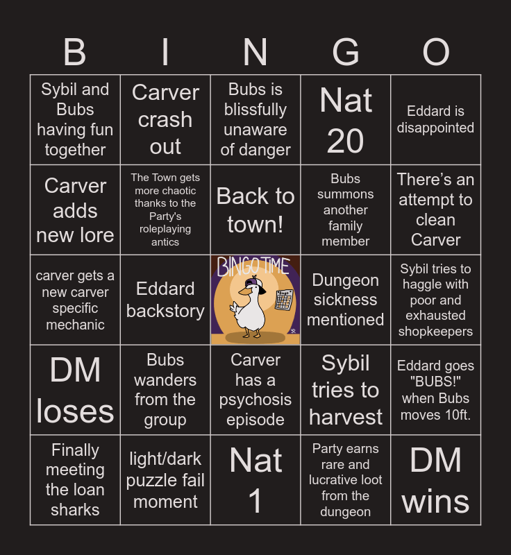 This bingo card has a free space and 24 words: Bubs wanders from the group, light/dark puzzle fail moment, Back to town!, Finally meeting the loan sharks, Eddard is disappointed, Sybil and Bubs having fun together, Carver adds new lore, Carver crash out, Dungeon sickness mentioned, Carver has a psychosis episode, Bubs summons another family member, carver gets a new carver specific mechanic, Sybil tries to harvest, Eddard goes "BUBS!" when Bubs moves 10ft., The Town gets more chaotic thanks to the Party's roleplaying antics, Party earns rare and lucrative loot from the dungeon, Sybil tries to haggle with poor and exhausted shopkeepers, Bubs is blissfully unaware of danger, There’s an attempt to clean Carver, Eddard backstory, DM wins, DM loses, Nat 20 and Nat 1.