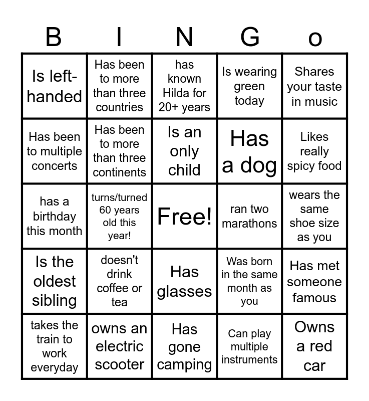 This bingo card has a free space and 24 words: takes the train to work everyday, doesn't drink coffee or tea, Is an only child, Can play multiple instruments, Shares your taste in music, Is left-handed, Has been to more than three countries, has known Hilda for 20+ years, ran two marathons, wears the same shoe size as you, has a birthday this month, Has been to more than three continents, Was born in the same month as you, Has met someone famous, Has been to multiple concerts, owns an electric scooter, Has gone camping, Is wearing green today, Likes really spicy food, Is the oldest sibling, turns/turned 60 years old this year!, Has glasses, Has a dog and Owns a red car.