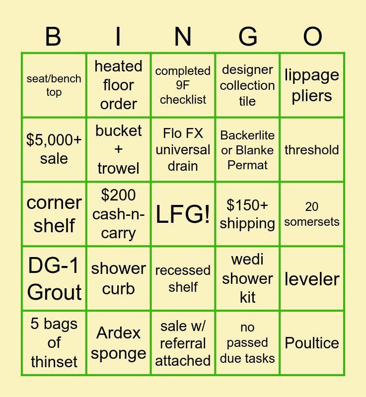 This bingo card has a free space and 24 words: 5 bags of thinset, shower curb, Flo FX universal drain, no passed due tasks, lippage pliers, seat/bench top, heated floor order, completed 9F checklist, $150+ shipping, 20 somersets, corner shelf, bucket + trowel, wedi shower kit, leveler, $5,000+ sale, Ardex sponge, sale w/ referral attached, designer collection tile, threshold, DG-1 Grout, $200 cash-n-carry, recessed shelf, Backerlite or Blanke Permat and Poultice.