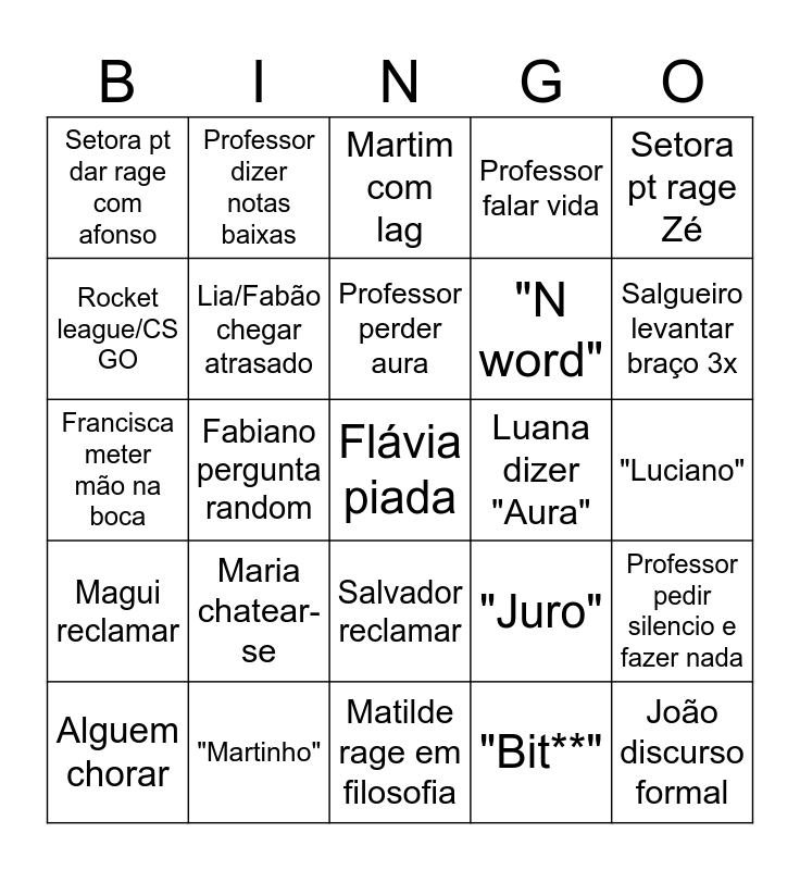 This bingo card has a free space and 29 words: Alguem chorar, Alguem chatear com as gémeas, Fabiano pergunta random, Pedro passar vergonha, Setora pt dar rage com afonso, Martim com lag, Lia/Fabão chegar atrasado, Maria chatear-se, Luana dizer "Aura", "Martinho", "Luciano", João discurso formal, Matilde rage em filosofia, "Bit**", Salgueiro levantar braço 3x, Sandro ser mandado calar, Salvador reclamar, Magui reclamar, Setora pt rage Zé, Francisca meter mão na boca, "Juro", "Epstein", "N word", Rocket league/CS GO, Professor falar vida, Professor dizer notas baixas, Professor pedir silencio e fazer nada, Professor perder aura and Professor ensinar lição de vida.