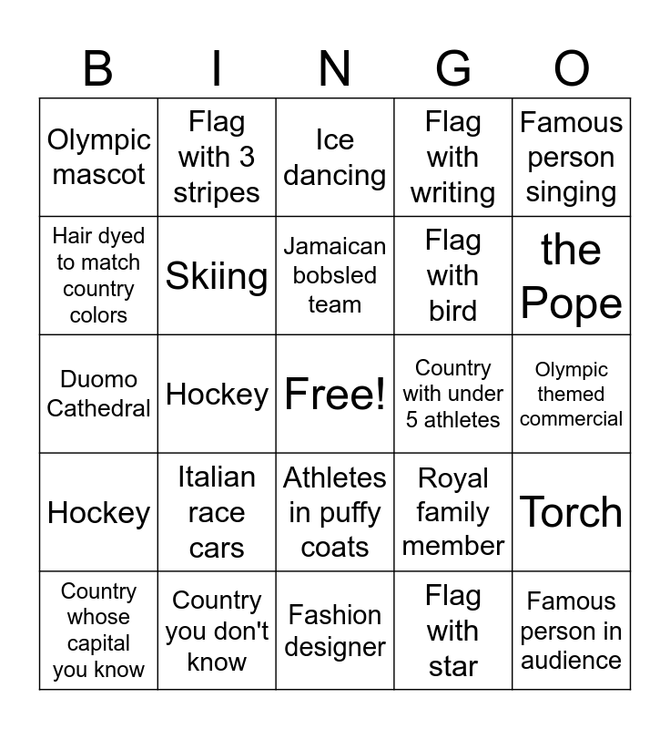 This bingo card has a free space and 26 words: Athletes in puffy coats, Flag with star, Jamaican bobsled team, Country you don't know, Famous person singing, Olympic mascot, Hair dyed to match country colors, Flag with 3 stripes, Olympic themed commercial, Royal family member, Flag with bird, Duomo Cathedral, Torch, Country whose capital you know, Hockey, Colorful pants on athletes, Flag with writing, Hockey, Ice dancing, Famous person in audience, the Pope, Fashion designer, Country with under 5 athletes, Italian race cars, Skiing and Figure skating.