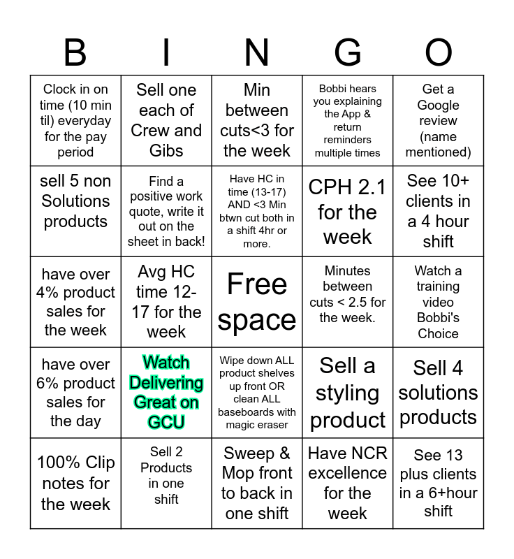 This bingo card has a free space and 24 words: Watch Delivering Great on GCU, Sell 2 Products in one shift, Have HC in time (13-17) AND <3 Min btwn cut both in a shift 4hr or more., 100% Clip notes for the week, Get a Google review (name mentioned), Clock in on time (10 min til) everyday for the pay period, sell 5 non Solutions products, Sell one each of Crew and Gibs, Minutes between cuts < 2.5 for the week., Wipe down ALL product shelves up front OR clean ALL baseboards with magic eraser, CPH 2.1 for the week, have over 4% product sales for the week, Sell a styling product, Sell 4 solutions products, Find a positive work quote, write it out on the sheet in back!, Have NCR excellence for the week, Watch a training video Bobbi's Choice, Min between cuts<3 for the week, See 10+ clients in a 4 hour shift, Avg HC time 12-17 for the week, See 13 plus clients in a 6+hour shift, have over 6% product sales for the day, Bobbi hears you explaining the App & return reminders multiple times and Sweep & Mop front to back in one shift.