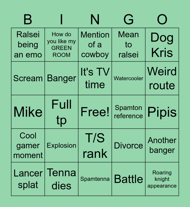 This bingo card has a free space and 24 words: Lancer splat, Explosion, It's TV time, Battle, Dog Kris, Ralsei being an emo, How do you like my GREEN ROOM, Mention of a cowboy, Spamton reference, Pipis, Mike, Banger, Divorce, Another banger, Scream, Tenna dies, Spamtenna, Mean to ralsei, Weird route, Cool gamer moment, Full tp, T/S rank, Watercooler and Roaring knight appearance.