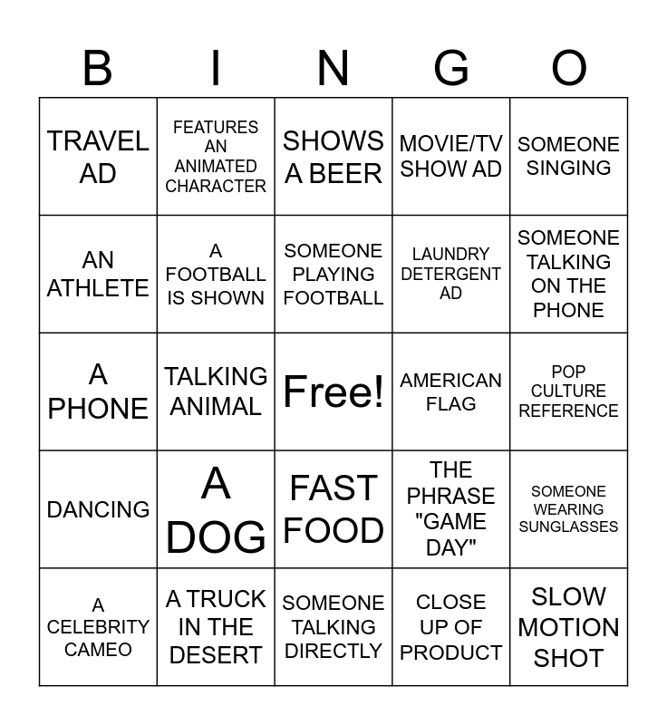 This bingo card has a free space and 24 words: A DOG, A TRUCK IN THE DESERT, SOMEONE PLAYING FOOTBALL, A CELEBRITY CAMEO, SOMEONE SINGING, TRAVEL AD, AN ATHLETE, FEATURES AN ANIMATED CHARACTER, AMERICAN FLAG, FAST FOOD, LAUNDRY DETERGENT AD, A PHONE, THE PHRASE "GAME DAY", SOMEONE WEARING SUNGLASSES, A FOOTBALL IS SHOWN, CLOSE UP OF PRODUCT, POP CULTURE REFERENCE, SHOWS A BEER, SOMEONE TALKING ON THE PHONE, TALKING ANIMAL, SLOW MOTION SHOT, DANCING, MOVIE/TV SHOW AD and SOMEONE TALKING DIRECTLY.
