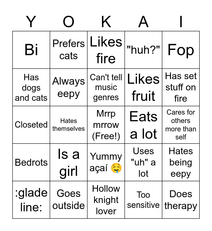This bingo card has a free space and 24 words: Is a girl, Goes outside, Can't tell music genres, :glade line:, Fop, Bi, Has dogs and cats, Prefers cats, Eats a lot, Yummy açaí 🤤, Likes fruit, Closeted, Uses "uh" a lot, Hates being eepy, Always eepy, Too sensitive, Cares for others more than self, Likes fire, Has set stuff on fire, Hates themselves, Does therapy, Bedrots, "huh?" and Hollow knight lover.