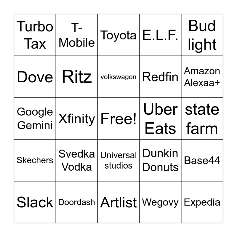 This bingo card has a free space and 28 words: Base44, Oakley Meta, Redfin, Wegovy, Dove, Toyota, T-Mobile, Skechers, Uber Eats, Slack, Google Gemini, E.L.F., Doordash, Artlist, Amazon Alexaa+, Jeep, Svedka Vodka, Ritz, volkswagon, Universal studios, Turbo Tax, Lays, Expedia, Xfinity, state farm, Dunkin Donuts, Bud light and Absolute Tabasco.