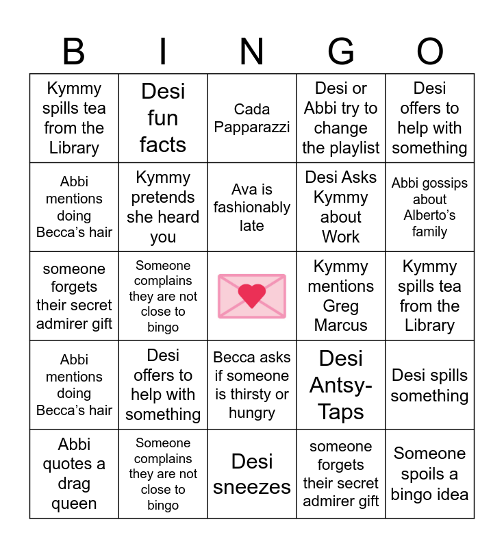 This bingo card has a free space and 85 words: Cada mentions a “remember when..” story, Cada tells someone to shut up or hush, Cada Papparazzi, Ava starts singing, Ava is fashionably late, Ava sings a song while ignoring the current conversation, Ava mentions baby, Desi Antsy-Taps, Desi fun facts, Desi spills something, Desi sneezes, Desi offers to help with something, Kymmy pretends she heard you, Kymmy mentions Greg Marcus, Kymmy has a “say la vie” moment, Kymmy spills tea from the Library, Abbi quotes a drag queen, Abbi mentions doing Becca’s hair, Abbi gossips about Alberto’s family, Desi or Abbi try to change the playlist, Desi or Abbi reference a video or meme only they know, Desi Asks Kymmy about Work, Someone spoils a bingo idea, Someone gets bingo, Someone complains they are not close to bingo, Someone mentions how many they need to get bingo, someone forgets their secret admirer gift, Becca gets distracted by a cute animal moment, Desi Asks Kymmy about Work, Becca isn’t ready when everyone gets there, Desi offers to help with something, Kymmy spills tea from the Library, Kymmy has a “say la vie” moment, someone forgets their secret admirer gift, Desi spills something, Desi or Abbi try to change the playlist, Desi sneezes, Becca or Cada don’t know who’s turn it is in a game, Abbi mentions doing Becca’s hair, Abbi gossips about Alberto’s family, becca starts something and doesn't finish, Ava starts singing, Ava mentions baby, Kymmy mentions Greg Marcus, Kymmy pretends she heard you, Becca asks if someone is thirsty or hungry, Someone mentions how many they need to get bingo, Abbi quotes a drag queen, Someone spoils a bingo idea, Desi or Abbi reference a video or meme only they know, Desi fun facts, Ava is fashionably late, Someone complains they are not close to bingo, Desi Antsy-Taps, Someone gets bingo, Ava sings a song while ignoring the current conversation, Someone complains they are not close to bingo, Desi or Abbi try to change the playlist, Cada mentions a “remember when..” story, Abbi mentions doing Becca’s hair, Becca or Cada don’t know who’s turn it is in a game, Cada tells someone to shut up or hush, Desi or Abbi reference a video or meme only they know, Someone mentions how many they need to get bingo, Someone spoils a bingo idea, Desi offers to help with something, Desi Asks Kymmy about Work, Desi spills something, Kymmy mentions Greg Marcus, Kymmy has a “say la vie” moment, Cada Papparazzi, becca starts something and doesn't finish, Someone gets bingo, Becca isn’t ready when everyone gets there, Kymmy pretends she heard you, Becca asks if someone is thirsty or hungry, someone forgets their secret admirer gift, Abbi gossips about Alberto’s family, Desi fun facts, Abbi quotes a drag queen, Kymmy spills tea from the Library, Becca gets distracted by a cute animal moment, Desi sneezes, Desi Antsy-Taps and Cada or Becca ask what’s going on.