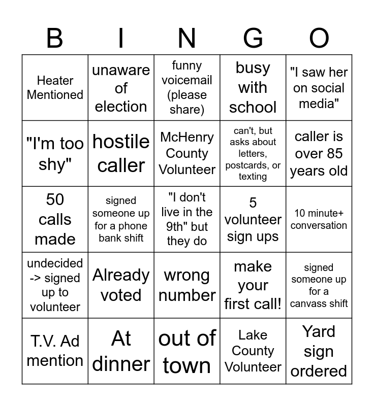 This bingo card has 25 words: Already voted, out of town, McHenry County Volunteer, T.V. Ad mention, "I saw her on social media", Heater Mentioned, "I'm too shy", unaware of election, 5 volunteer sign ups, wrong number, can't, but asks about letters, postcards, or texting, 50 calls made, make your first call!, signed someone up for a canvass shift, hostile caller, Yard sign ordered, 10 minute+ conversation, funny voicemail (please share), caller is over 85 years old, signed someone up for a phone bank shift, "I don't live in the 9th" but they do, At dinner, undecided -> signed up to volunteer, busy with school and Lake County Volunteer.