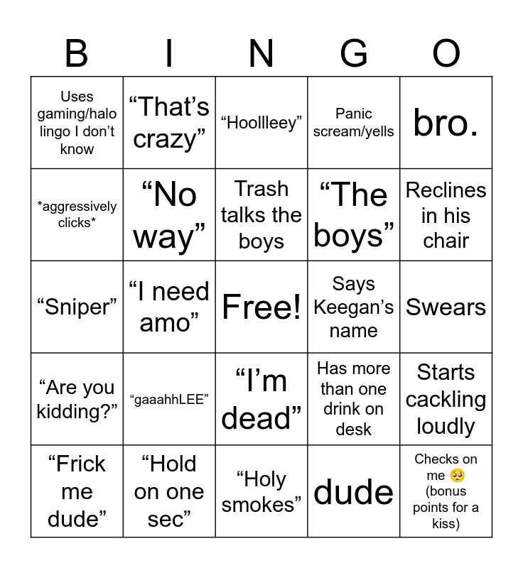 This bingo card has a free space and 24 words: “gaaahhLEE”, “Hold on one sec”, Trash talks the boys, “Frick me dude”, bro., Uses gaming/halo lingo I don’t know, *aggressively clicks*, “That’s crazy”, Says Keegan’s name, “I’m dead”, “The boys”, “Sniper”, Has more than one drink on desk, Starts cackling loudly, “No way”, dude, Swears, “Hoollleey”, Reclines in his chair, “I need amo”, Checks on me 🥺 (bonus points for a kiss), “Are you kidding?”, Panic scream/yells and “Holy smokes”.