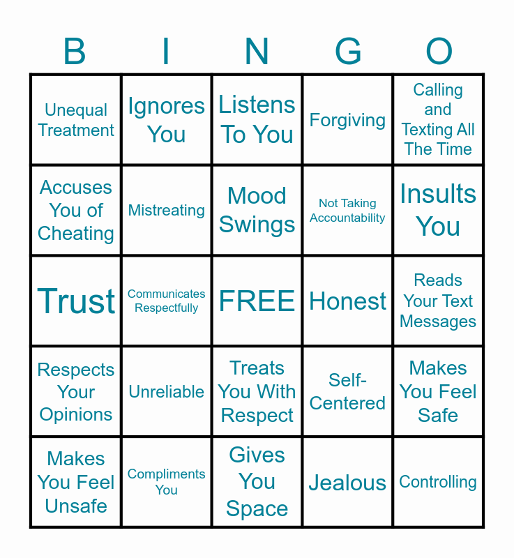 This bingo card has a free space and 43 words: Invades Privacy, Controlling, Wants To Spend All Their Time With You, Makes You Feel Unsafe, Very Demanding, Jealous, Listens To You, Lies Often, Calling and Texting All The Time, Compliments You, Forgiving, Honest, Treats You With Respect, Unreliable, Supportive, Gives You Space, Makes You Feel Loved, Trust, Smashes or Destroys Things, Insults You, Ignores You, Physically Aggressive, Communicates Aggressively, Unequal Treatment, Lets You Enjoy Time With Your Friends, Reads Your Text Messages, Tells You How To Dress, Apologizing When They Are Wrong, Self-Centered, Respects Your Opinions, Equal Decision Making, Makes You Feel Safe, Grabbing Pushing or Hitting, Communicates Respectfully, Explosive Temper, Possessiveness, Extremely Jealous or Insecure, Mood Swings, Accuses You of Cheating, Not Taking Accountability, Enjoying Time Away From Each Other, Mistreating and Threatens To Harm You.