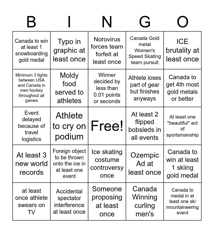 This bingo card has a free space and 24 words: Foreign object to be thrown onto the ice in at least one event, Accidental spectator interference at least once, Winner decided by less than 0.01 points or seconds, at least once athlete swears on TV, ICE brutality at least once, Canada to win at least 1 snowboarding gold medal, Minimum 3 fights between USA and Canada in men hockey throughout all games, Typo in graphic at least once, At least 2 flipped bobsleds in all events, Ice skating costume controversy once, Athlete loses part of gear but finishes anyways, Event delayed because of travel logistics, Ozempic Ad at least once, Canada to win at least 1 skiing gold medal, Moldy food served to athletes, Canada Winning curling men's, At least one "beautiful" act of sportsmanship, Norovirus forces team forfeit at least once, Canada to get 4th most gold metals or better, Athlete to cry on podium, Canada to medal in at least one ski mountaineering event, At least 3 new world records, Canada Gold metal Women's Speed Skating team pursuit and Someone proposing at least once.