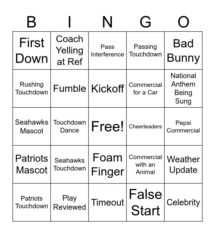 This bingo card has a free space and 29 words: Patriots Touchdown, Field Goal, Touchdown Dance, Coca Cola Commercial, First Down, Pass Interference, Fumble, Seahawks Touchdown, Cheerleaders, Play Reviewed, Pepsi Commercial, Celebrity, Timeout, False Start, National Anthem Being Sung, Fan with Painted Face, Foam Finger, Patriots Mascot, Bad Bunny, Seahawks Mascot, Commercial with an Animal, Ariel View of Levi's Stadium, Commercial for a Car, Rushing Touchdown, Passing Touchdown, Coach Yelling at Ref, Weather Update, Kickoff and Halftime.