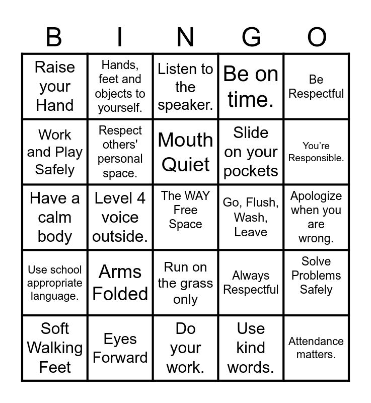 This bingo card has a free space and 24 words: Arms Folded, Eyes Forward, Mouth Quiet, Soft Walking Feet, Be Respectful, Raise your Hand, Work and Play Safely, Hands, feet and objects to yourself., Go, Flush, Wash, Leave, Run on the grass only, Slide on your pockets, Have a calm body, Always Respectful, Solve Problems Safely, Respect others' personal space., Use kind words., Apologize when you are wrong., Listen to the speaker., You’re Responsible., Level 4 voice outside., Attendance matters., Use school appropriate language., Be on time. and Do your work..