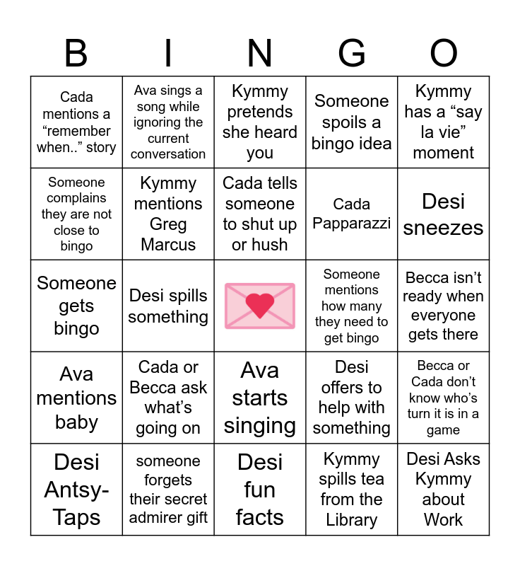 This bingo card has a free space and 28 words: Becca or Cada don’t know who’s turn it is in a game, becca starts something and doesn't finish, Cada Papparazzi, Kymmy spills tea from the Library, Someone complains they are not close to bingo, Kymmy pretends she heard you, Ava sings a song while ignoring the current conversation, Ava mentions baby, Someone mentions how many they need to get bingo, Desi Antsy-Taps, Someone gets bingo, Someone spoils a bingo idea, someone forgets their secret admirer gift, Desi fun facts, Desi sneezes, Becca gets distracted by a cute animal moment, Cada or Becca ask what’s going on, Kymmy mentions Greg Marcus, Cada tells someone to shut up or hush, Ava starts singing, Cada mentions a “remember when..” story, Ava is fashionably late, Desi Asks Kymmy about Work, Desi spills something, Becca isn’t ready when everyone gets there, Desi offers to help with something, Kymmy has a “say la vie” moment and Becca asks if someone is thirsty or hungry.