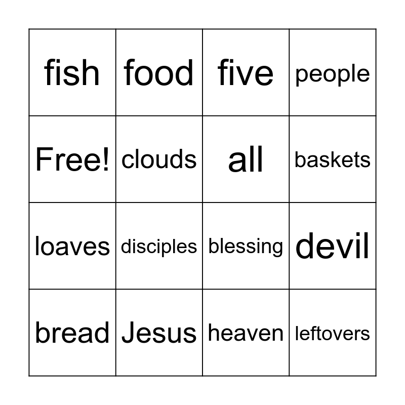 This bingo card has 16 words: Jesus, devil, five, fish, loaves, food, blessing, heaven, Free!, clouds, bread, people, disciples, baskets, all and leftovers.