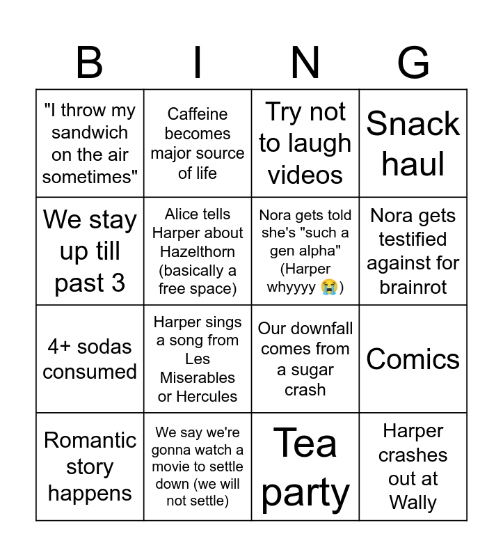 This bingo card has 16 words: Romantic story happens, We say we're gonna watch a movie to settle down (we will not settle), Try not to laugh videos, Snack haul, We stay up till past 3, Caffeine becomes major source of life, Our downfall comes from a sugar crash, Comics, "I throw my sandwich on the air sometimes", Alice tells Harper about Hazelthorn (basically a free space), Tea party, Nora gets testified against for brainrot, 4+ sodas consumed, Harper sings a song from Les Miserables or Hercules, Nora gets told she's "such a gen alpha" (Harper whyyyy 😭) and Harper crashes out at Wally.