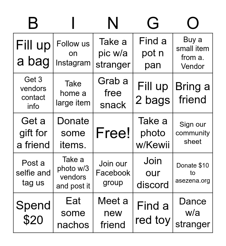 This bingo card has a free space and 24 words: Take a photo w/3 vendors and post it, Eat some nachos, Grab a free snack, Spend $20, Buy a small item from a. Vendor, Fill up a bag, Get 3 vendors contact info, Follow us on Instagram, Take a photo w/Kewii, Join our Facebook group, Fill up 2 bags, Get a gift for a friend, Join our discord, Donate $10 to asezena.org, Take home a large item, Find a red toy, Sign our community sheet, Take a pic w/a stranger, Bring a friend, Donate some items., Dance w/a stranger, Post a selfie and tag us, Find a pot n pan and Meet a new friend.