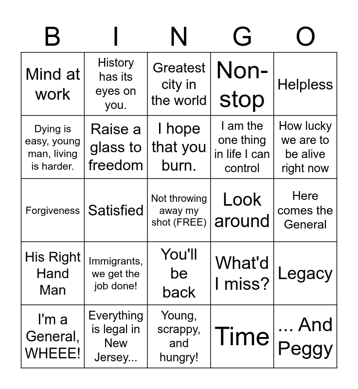This bingo card has a free space and 50 words: Rise Up, ... And Peggy, Aaron Burr, Sir, Young, scrappy, and hungry!, Immigrants, we get the job done!, Wait for it., History has its eyes on you., Talk less, smile more., Dying is easy, young man, living is harder., Who tells your story?, Raise a glass to freedom, Non-stop, Legacy, What'd I miss?, Everything is legal in New Jersey., Remind you of my love, I hope that you burn., Look around, Work!, Helpless, Satisfied, Time, Mind at work, I am the one thing in life I can control, I want a revelation, Include women in the sequel, WORK!, How lucky we are to be alive right now, I will choose her happiness over mine every time, Greatest city in the world, You'll be back, Room where it happens, Awesome, wow!, Don't tax the South cuz we got it made in the shade, I'm super dead, Everything is legal in New Jersey..., Vote for Burr!, Jefferson has beliefs. Burr has none., Best of wives and best of women., 32,000 troops in New York Harbor, Here comes the General, BOOM!, You are the worst, Burr., Let's steal their cannons!, Shut the door on your way out., I'm a General, WHEEE!, Forgiveness, Stay alive, Be enough, His Right Hand Man and Narrative.