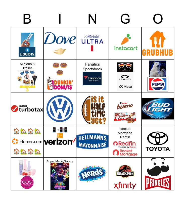 This bingo card has 39 images, a free space and 15 words: Bosch Appliances, π₯‘πππ₯€ ππ, π©π©π©, Fanatics Sportsbook, Franks Red Hot, π π‘π π‘ π π‘π π‘, π±π²π³π΄, Lays Chips π₯, Mandarin & Grogu Movie Trailer, Rocket Mortgage Redfin, Minions 3 Trailer, PokΓ©mon 30th Anniversary, Poppi Soda, Svedka Vodka and Super Mario Galaxy.