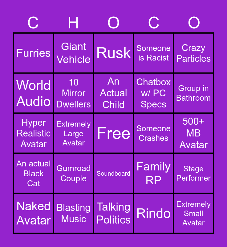 This bingo card has a free space and 24 words: Gumroad Couple, Blasting Music, An Actual Child, Naked Avatar, Crazy Particles, Furries, World Audio, Giant Vehicle, Someone Crashes, Soundboard, Chatbox w/ PC Specs, Hyper Realistic Avatar, Family RP, Stage Performer, 10 Mirror Dwellers, Rindo, 500+ MB Avatar, Rusk, Group in Bathroom, Extremely Large Avatar, Extremely Small Avatar, An actual Black Cat, Someone is Racist and Talking Politics.