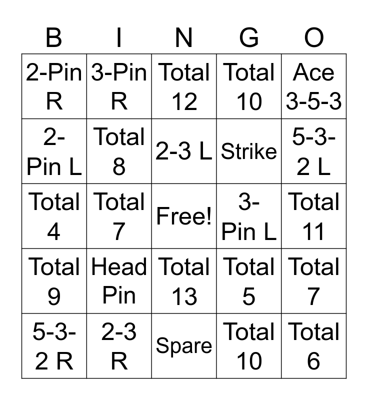 This bingo card has a free space and 24 words: Head Pin, 2-3 R, 2-3 L, 5-3-2 R, Ace 3-5-3, 2-Pin R, 2-Pin L, 3-Pin R, 3-Pin L, Total 13, Strike, Total 4, Total 5, Total 7, Total 8, Total 10, Total 11, Total 12, 5-3-2 L, Total 7, Total 6, Total 9, Total 10 and Spare.