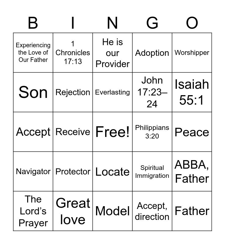 This bingo card has a free space and 51 words: Love, Father, Instructor, Model, Protector, John 3:16, 1 Chronicles 17:13, 1 John 3:2, Son, Marvelous Manifestations of God's Love, Rejection, Adoption, ABBA, Father, Spiritual Immigration, Loving kindness, Faith, Everlasting, Philippians 3:20, Foundation of the world, Worshipper, Receive, Accept, direction, Experiencing the Love of Our Father, John 17:23–24, A greater revelation of God’s love, 1 John 4:16, Isaiah 55:1, Yes, The Lord’s Prayer, He is our Provider, Forgive others, Protection and direction, Heirs, Good, Fear, Great love, Singing, Birds, Secret, openly, Separate, Peace, Navigator, Ephesians 5:1, NOW, 1 John 3:2, John 8:28, Accept, Persist, Foundation, Locate and Recognize.