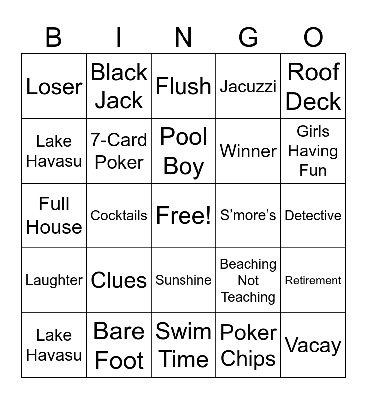 This bingo card has a free space and 47 words: Murder Mystery, Vacay, Who Did It?, Swim Time, Clues, Casino, Black Jack, Twenty-One, Lake Havasu, Girls Night, 7-Card Poker, Jacuzzi, Retirement, Beaching Not Teaching, Family, Friends, Pool Boy, S’more’s, Fire Pit, Roof Deck, Cocktails, Poker Chips, Loser, Winner, High Low, Girls Having Fun, Lake Havasu, Boating, Sunshine, Laughter, Cover All, It Wasn’t Me, Kids Left Behind, Not My Problem, Beach Bag, Bare Foot, Detective, Murder Weapon, Victim, Playing Cards, Ace High, Flush, Full House, A pair, Two Pairs, 3 of a Kind and Party Time.