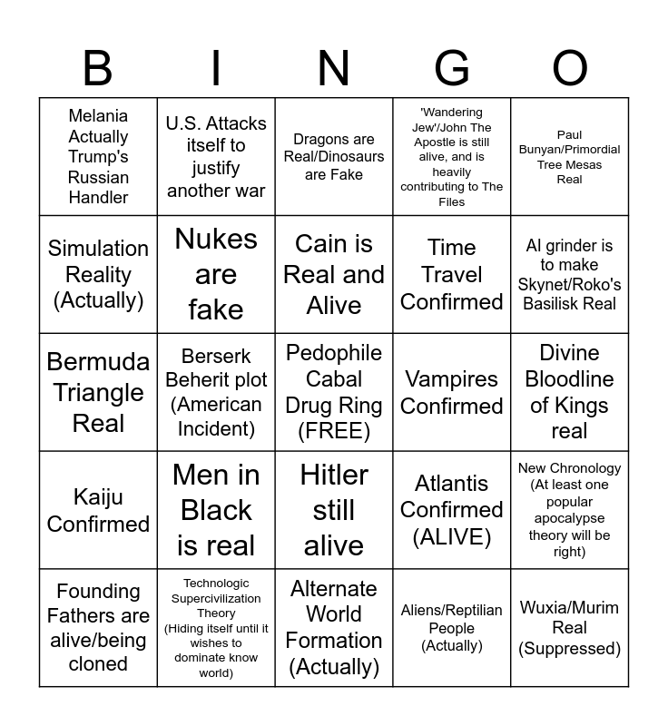 This bingo card has a free space and 24 words: Men in Black is real, Technologic Supercivilization Theory (Hiding itself until it wishes to dominate know world), Cain is Real and Alive, Founding Fathers are alive/being cloned, Paul Bunyan/Primordial Tree Mesas Real, Melania Actually Trump's Russian Handler, Simulation Reality (Actually), U.S. Attacks itself to justify another war, Vampires Confirmed, Hitler still alive, Time Travel Confirmed, Bermuda Triangle Real, Atlantis Confirmed (ALIVE), New Chronology (At least one popular apocalypse theory will be right), Nukes are fake, Aliens/Reptilian People (Actually), Divine Bloodline of Kings real, Dragons are Real/Dinosaurs are Fake, AI grinder is to make Skynet/Roko's Basilisk Real, Berserk Beherit plot (American Incident), Wuxia/Murim Real (Suppressed), Kaiju Confirmed, 'Wandering Jew'/John The Apostle is still alive, and is heavily contributing to The Files and Alternate World Formation (Actually).
