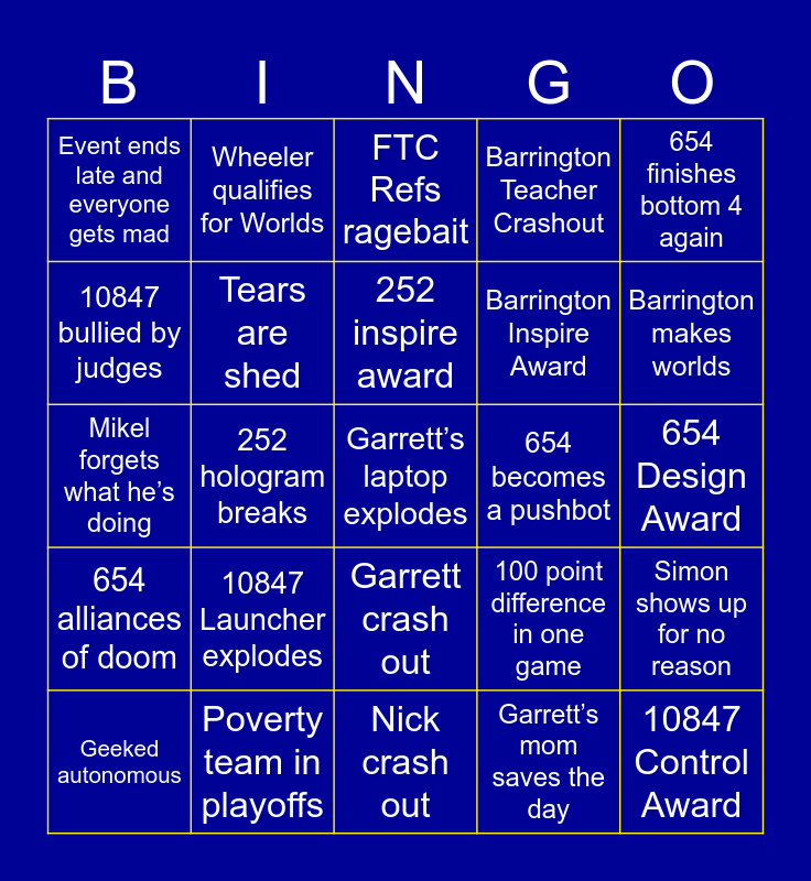 This bingo card has 25 words: 10847 Launcher explodes, Nick crash out, 252 inspire award, Geeked autonomous, 654 finishes bottom 4 again, Event ends late and everyone gets mad, 10847 bullied by judges, Wheeler qualifies for Worlds, 654 becomes a pushbot, Garrett crash out, Barrington Inspire Award, Mikel forgets what he’s doing, 100 point difference in one game, Simon shows up for no reason, Tears are shed, 10847 Control Award, 654 Design Award, FTC Refs ragebait, Barrington makes worlds, 252 hologram breaks, Garrett’s laptop explodes, Poverty team in playoffs, 654 alliances of doom, Barrington Teacher Crashout and Garrett’s mom saves the day.