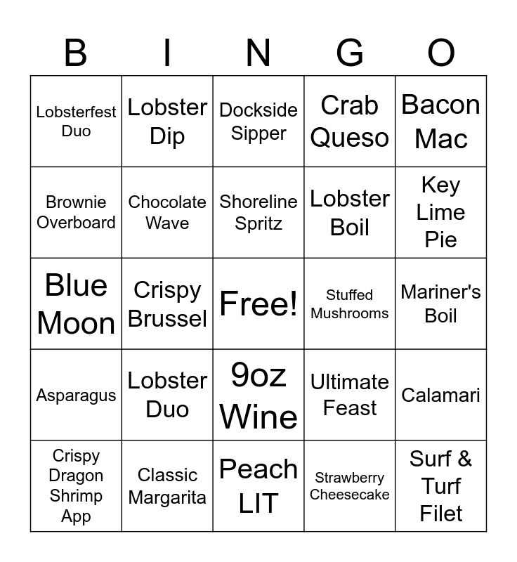 This bingo card has a free space and 24 words: Crispy Dragon Shrimp App, Lobster Duo, Shoreline Spritz, Strawberry Cheesecake, Bacon Mac, Lobsterfest Duo, Lobster Dip, Dockside Sipper, Stuffed Mushrooms, Mariner's Boil, Blue Moon, Chocolate Wave, Ultimate Feast, Calamari, Brownie Overboard, Classic Margarita, Peach LIT, Crab Queso, Key Lime Pie, Asparagus, Crispy Brussel, 9oz Wine, Lobster Boil and Surf & Turf Filet.