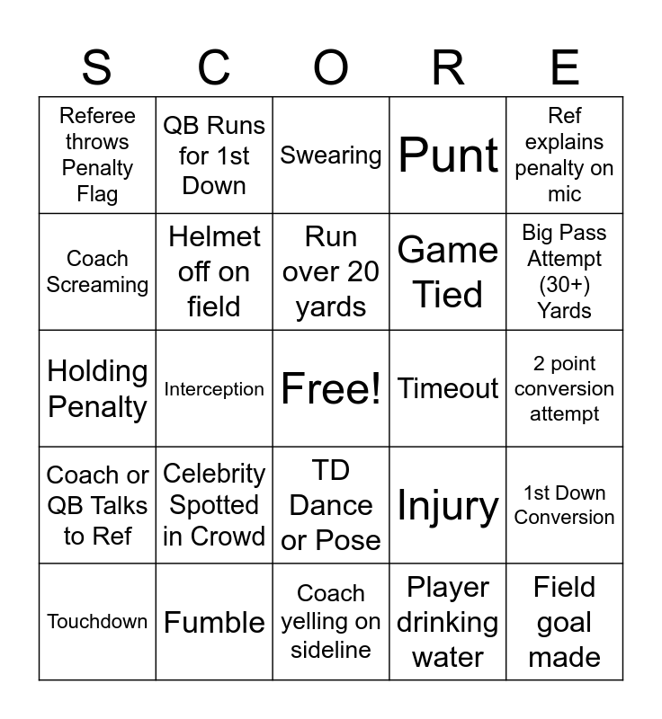 This bingo card has a free space and 29 words: Touchdown, Quarterback Sacked, Interception, 4th down conversion attempt, Referee throws Penalty Flag, Swearing, Helmet off on field, Celebrity Spotted in Crowd, Timeout, Fumble, 2 point conversion attempt, Field goal made, Coach yelling on sideline, Player drinking water, Big Pass Attempt (30+) Yards, Player Dives for Endzone, TD Dance or Pose, Coach or QB Talks to Ref, Ref explains penalty on mic, Holding Penalty, Injury, Tush Push, Game Tied, Coach Screaming, Punt, QB Runs for 1st Down, 1st Down Conversion, Run over 20 yards and Play goes under review.