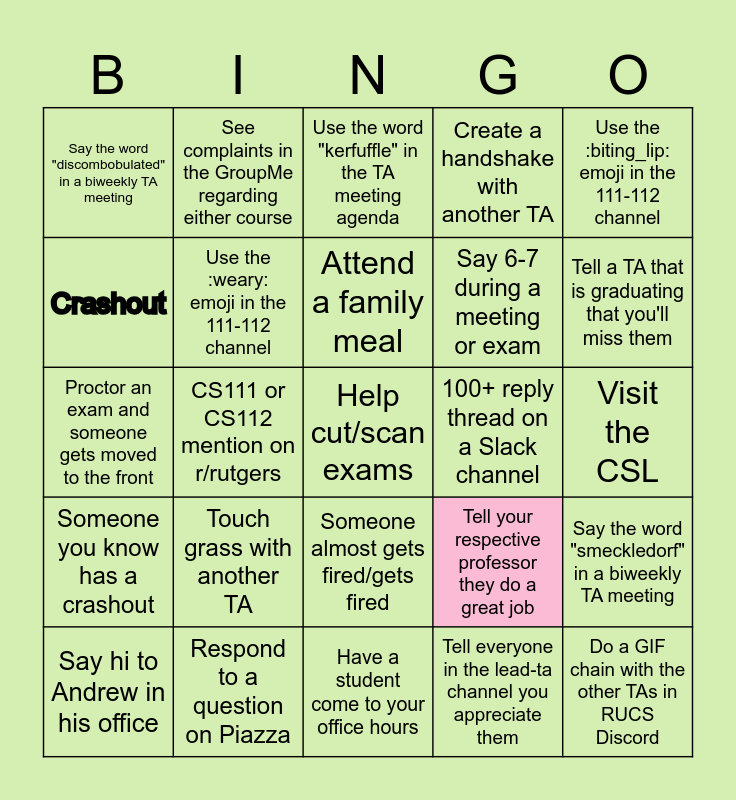 This bingo card has 25 words: Touch grass with another TA, Have a student come to your office hours, Attend a family meal, Say hi to Andrew in his office, Use the :biting_lip: emoji in the 111-112 channel, Say the word "discombobulated" in a biweekly TA meeting, Crashout, See complaints in the GroupMe regarding either course, 100+ reply thread on a Slack channel, Someone almost gets fired/gets fired, Say 6-7 during a meeting or exam, Proctor an exam and someone gets moved to the front, Tell your respective professor they do a great job, Say the word "smeckledorf" in a biweekly TA meeting, Use the :weary: emoji in the 111-112 channel, Do a GIF chain with the other TAs in RUCS Discord, Visit the CSL, Use the word "kerfuffle" in the TA meeting agenda, Tell a TA that is graduating that you'll miss them, CS111 or CS112 mention on r/rutgers, Help cut/scan exams, Respond to a question on Piazza, Someone you know has a crashout, Create a handshake with another TA and Tell everyone in the lead-ta channel you appreciate them.