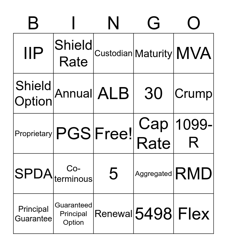 This bingo card has a free space and 24 words: Co-terminous, Guaranteed Principal Option, ALB, Principal Guarantee, MVA, IIP, Shield Option, Shield Rate, Cap Rate, 5, 30, Proprietary, Aggregated, RMD, Annual, 5498, 1099-R, Custodian, Crump, PGS, Flex, SPDA, Maturity and Renewal.