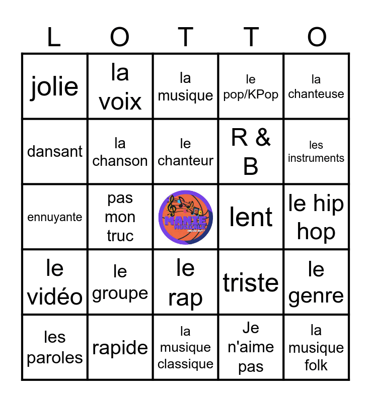 This bingo card has a free space and 34 words: J'aime, Je n'aime pas, le rythme, le son, le vidéo, la chanson, la chanteuse, les paroles, la voix, le méssage, le chanteur, la musique, la danse, le rock, lent, les instruments, rapide, ennuyante, le groupe, triste, le rap, le country, jolie, le hip hop, la musique classique, la musique folk, le pop/KPop, le mélodie, R & B, dansant, unique, pas mon truc, le genre and banal(e).
